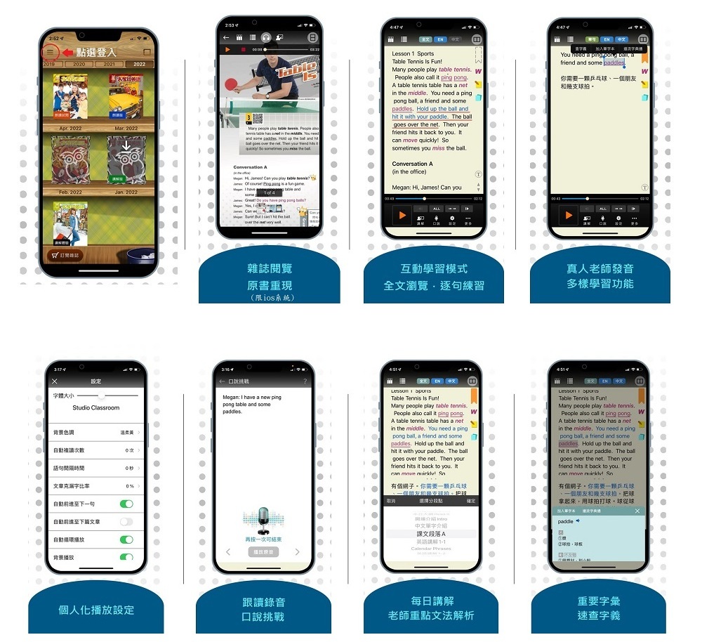 因為內容皆出自空中英語雜誌系列,原有的單字、文法、例句、會話、有聲書、課程講解、練習題...等等皆全數上架到App中,讓你可以隨時隨地抓緊每一段空閒時間學習,另外在安靜的空間也很適合開麥克風跟著有聲書出聲錄製,讓外師與自己的聲音輪流播放,就更能比較腔調、咬字上的差異,進而自我調整!
